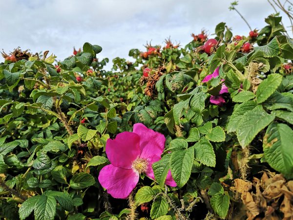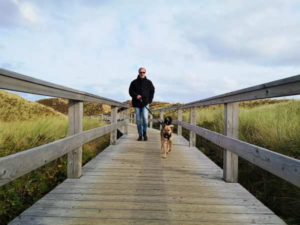 Es dauert keine zehn Minuten, um vom Campingplatz in die Dünen zu gehen und weiter auf dem Bohlenweg, von wilden Rosen gesäumt, zum Hundestrand am Roten Kliff zu laufen. Hier gilt zwar wie überall an den Hundestränden auf der Insel Leinenpflicht. Aber am frühen Morgen tut`s auch mal eine Schleppleine. Später am Tag wird`s hier dann schon mal voller. Denn am Strandabgang neben dem Hundestrand residiert auch „Onkel Johnny’s Strandwirtschaft“. Ein schöner Ort für einen Sundowner mit Hund, finden wir.