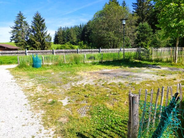 In Lechbruck am See, keine 30 Autokilometer von den Königsschlössern Neuschwanstein und Hohenschwangau entfernt, liegt der Campingplatz Via Claudia Camping direkt am Ufer des Lechstausees mit beeindruckendem Blick auf die Alpen. Der sehr hundefreundliche und bei Hundeleuten entsprechend beliebte Platz bietet eine ganze Reihe von eingezäunten Parzellen für Wohnwagen, Wohnmobile und Vans. Rechts und links trennen robuste Holzzäune den eigenen Stellplatz von den Nachbarn ab. An der Stirnseite, wo Menschen mit unterschiedlich großen Gefährten rein- und rausfahren, begrenzt ein gut brusthohes Knotengitter, wie man es von mobilen Schafweiden kennt, den Stellplatz. Die eingezäunten Parzellen liegen alle oberhalb des Geländes in direkter Nähe zum Wald.