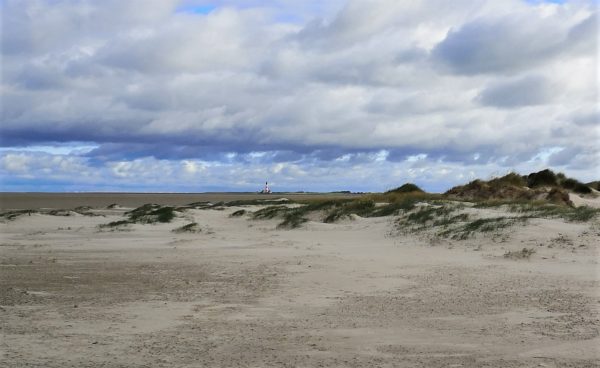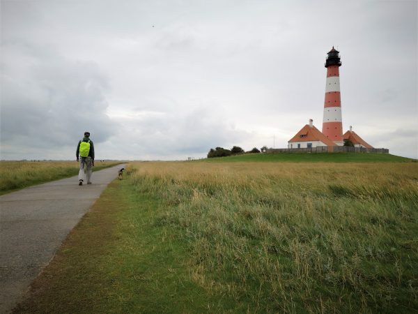 Der Hundestrand in Ording im Strandabschnitt Ording-Nord ist unser Lieblingshundestrand. Weil es hier ruhiger zugeht, Menschen mit Hund fast unter sich sind, dir keine Strandsegler in die Quere kommen und du nicht erst die Seebrücke überqueren und gut 600 Meter über den Strand laufen musst, um die Freilaufzone zu erreichen. Zudem ist der Standabschnitt ebenso tief und weitläufig wie der in Bad. Wir erreichen ihn über einen schönen Weg über den Deich mit weitem Blick über Land und Meer. Am Strandabschnitt Hungerdamm geht es dann auf einem schmalen Pfad durch die Dünen. In der Ferne sehen wir einen echten Promi herübergrüßen: den Leuchtturm Westerheversand. Die geringelte Schönheit war über viele Jahre in den Werbespots für Jever zu sehen.
