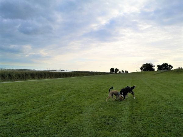 Das Fahrradwegenetz ist hier sehr gut ausgebaut. Für Touren entlang der Deiche und für Abstecher ins Hinterland bietet es sich also an, Fahrräder plus Hundehänger mitzunehmen. Beides lässt sich auch vor Ort mieten. Selbst auf den Fahrradwegen, die durch die eingezäunten Schafweiden an den Deichen führen, dürfen Hunde an der kurzen Leine in der Regel mit, auch am Fahrrad.