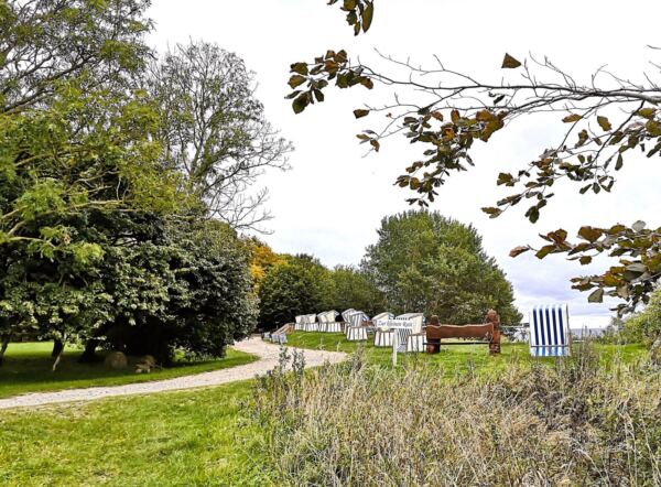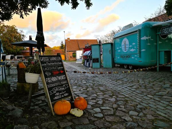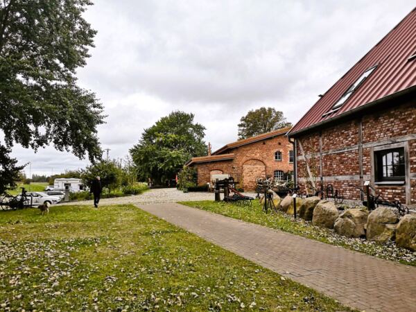 An hellen Tagen zieht der Rügenhof viele Besucher:innen an, auch in der Nebensaison. Wir hatten also immer etwas zu gucken. Besonders schön ist die Stimmung auch am frühen Abend, wenn sich das Gelände geleert hat. Dann senkt sich Stille über die alten Gemäuer, der Wind flüstert in den ausladenden Weiden, Fledermäuse werden wach und dann melden sich auch die Eulen. Wir fühlten uns in ein früheres Jahrhundert zurückversetzt.