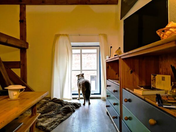 Wir haben mit Amos in einer FeWo im einstigen Schafstall gewohnt. Das freiliegende Gebälk gibt der Wohnung ein besonderes Flair – und hat uns stellenweise den Kopf einziehen lassen. 😊 Auch wenn der Rügenhof mitten im Ort liegt, ist`s von hier aus nur ein Katzensprung ins freie Gelände, wo sich der Hund erleichtern kann. Hinter dem Hof liegen Wiesen und Felder, ein Plattenweg führt hindurch. Ideal für den kurzen Gang am Morgen. Wir haben es geliebt, nach dieser ersten frühen Runde einen zweiten Wachmacher auf der Terrasse des „Kaffeegruss“ zu trinken. Das Café nebst eigener Rösterei ist ebenfalls im Schafstall untergebracht, Besitzer Steffen ein begeisterter Gastgeber mit großem Herz für Hunde. Die sind auch im Innenraum des Cafés erlaubt.