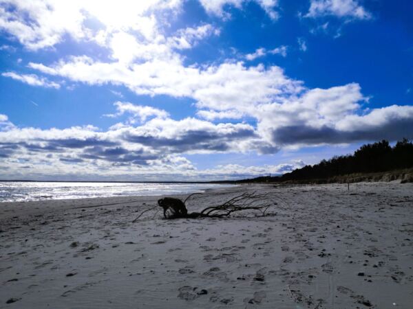 In diesen Strand mit dem gewöhnungsbedürftigen Namen haben wir uns sofort verliebt: Die Schaabe ist mit 11 km der längste Ostseestrand Rügens. Feinsandig, mal nur rund 600 m, dann bis zu 2 km breit. An der Schaabe gibt es zwei offizielle Hundestrände ohne Leinenpflicht, der eine am südlichen Ende im Seebad Glowe (zwischen Strandaufgang 11 und 12), der andere am nördlichen Ende im Seebad Juliusruh (Strandaufgang Strandidyll). Nördlich von Juliusruh Richtung Altenkirchen und weiter Richtung Richtung Kap Arkona schließt sich ein Naturstrand an, der in nördlicher Richtung immer steiniger wird. Hier finden sich auch sandige Fleckchen, an denen der Hund auch zur Hauptsaison mitdarf. Außerhalb der Saison sind wir an der Schaabe mit Hund stundenlang am Strand gewandert. Und dann hinüber über die Nehrung zum Bodden auf die andere Seite spaziert. Traumschön.