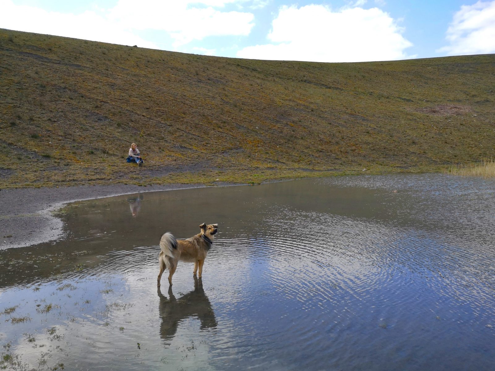 Im See auf der Halde Mottbruch. An der tiefsten Stelle reicht unserem Amos das klare Wasser bis weit über den Bauch.
