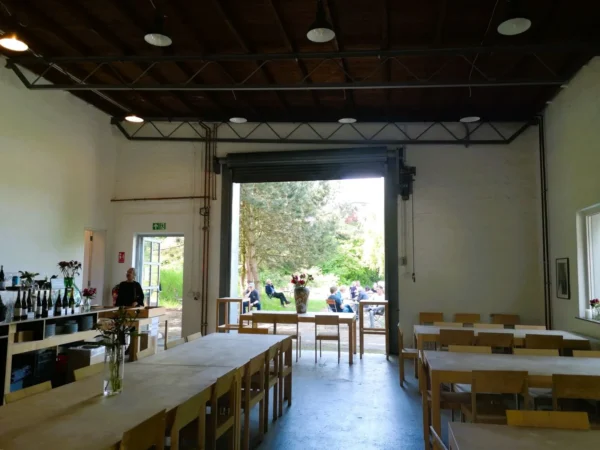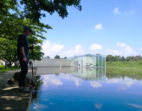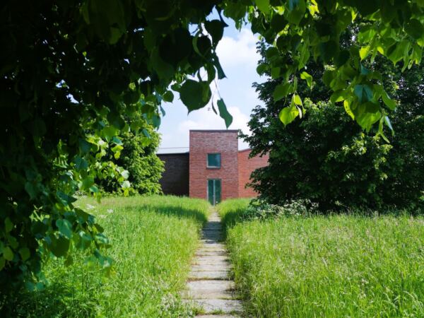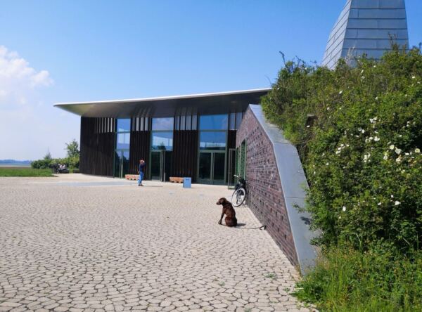 Der strategische Bahndamm diente einst militärischen Zwecken. Heute bieten die Bäume und Büsche am Wegrand Lebensraum für viele Tiere und Pflanzen. Eine ähnlich wechselvolle Geschichte hat die Raketenstation Hombroich hinter sich. Das 13 h großen Museumsgelände nutzte die NATO als Raketenstellung. In den 90er Jahren baute ein Architekten-Team die Gebäude um, fügte Skulpturen hinzu – und begeisterte das Publikum der Architektur-Biennale in Venedig mit seinen Entwürfen. Auch wir lieben das Ensemble, das Bildhauern, Komponisten, Schriftstellern und Wissenschaftlern Lebens- und Arbeitsräume bietet. Mit Hund lässt sich wunderbar hindurchschlendern, vorbei an wilden Blumen, die in schönem Kontrast zu den manchmal futuristischen, oft japanisch anmutenden Gebäuden stehen. Beton und Backstein, Holz und Glas – alles zeitlos schön. Ein toller Treffpunkt für Menschen mit und ohne Hund: das Café Biemel (Öffnungszeiten: April – Oktober, Freitag – Sonntag und an Feiertagen,12 bis 18 Uhr). Lässige Loft-Atmosphäre, dazu ein paar Tische und Stühle unter Kiefern. Großartig.