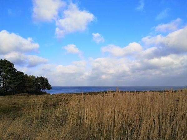 Weiter Blick über Heide und Meer und eine kleine Bucht, in der unser Amos mit neuen Freunden (an der Schleppleine) getobt hat. Auch diese kleine Tour ist wunderschön – und lässt sich wunderbar mit einer Einkehr in der hundefreundlich-entspannten „Hafenkneipe“ verbinden.
