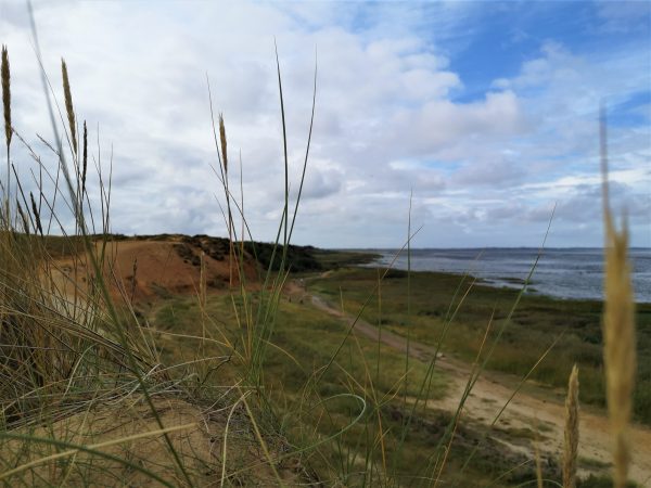 Über dem Hundestrand Nord liegt das berühmte Rote Kliff. Hindurch führt ein Wanderweg. Wunderschön für eine morgendliche Runde mit dem Hund an der Schleppleine.