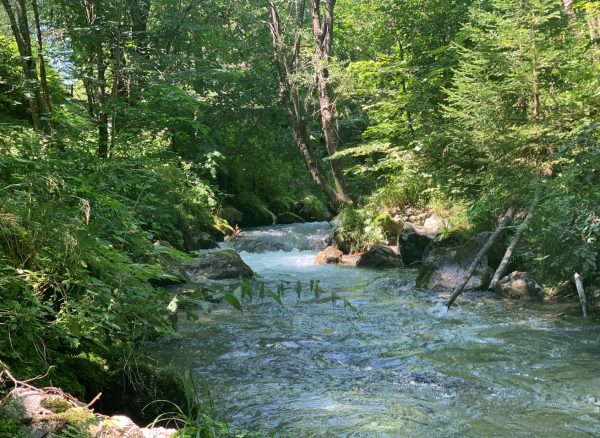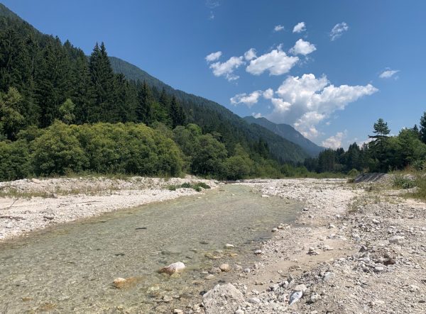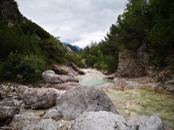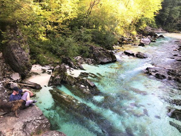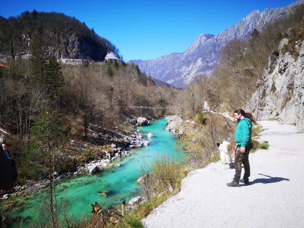 Sloweniens Bergparadies im Nordwesten. Die Gipfel kratzen hier an der Dreitausender-Marke. Unglaublich: das Türkisblau des Flusses Soča mit seinen Nebenarmen. Wir dachten, es sei Photoshop, als wir Bilder der Soča gesehen hatten – bis wir mit unseren Hunden drinstanden. Keine Bildbearbeitung, sondern Realität.