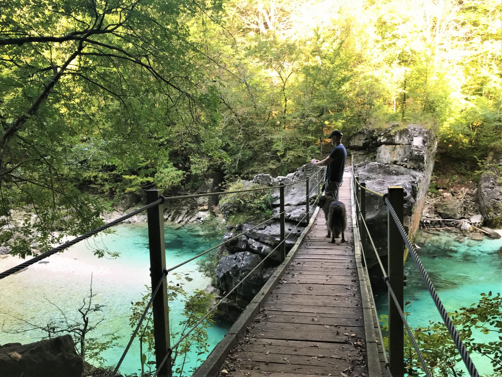 Aber Achtung: Hier wie vielerorts an der Soča und ihren Armen müsst ihr Hängebrücken überqueren. Nicht jeder Hund traut den schwankenden Stegen. Aber das kann man hier wunderbar trainieren.