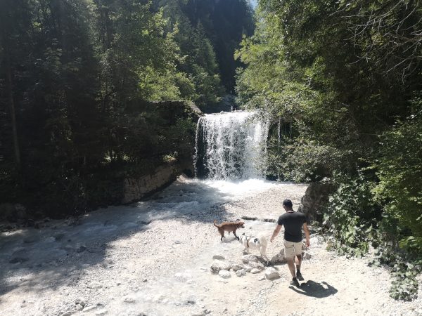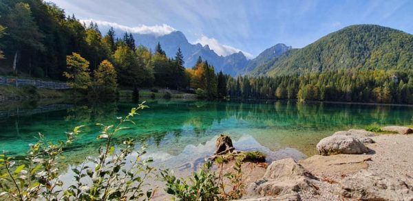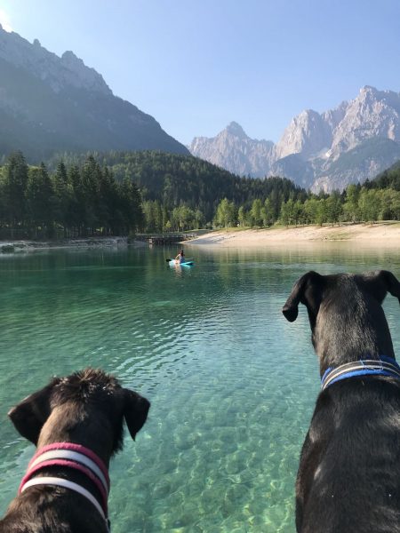 Wer mit seinen Hunden entspannt baden möchte, für den lohnt sich ein Abstecher von Bovec über den Predil-Pass ins nahe Italien. Vor allem am baumbestandenen Ostufer des glasklaren Lago de Predil verbringen Einheimische und Tourist:innen mit Hunden gerne den ganzen Tag. Ohne Trubel. Wir haben hier wunderbar entspannt.