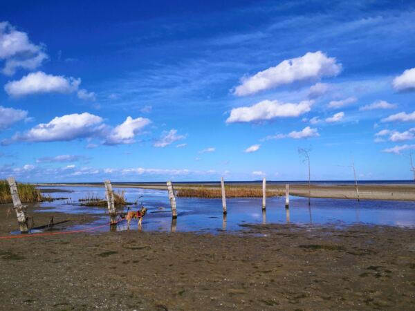 Zu den bekannteren gehört die Bucht auf der Halbinsel Gnitz, die schon als Strand durchgeht. Auch wenn der Sand am Achterwasser nicht so feinkörnig ist wie der Sandstrand an der Küste, lohnt sich unseres Erachtens ein Besuch des Achterwassers. Der Badeausflug lässt sich wunderbar mit einer Hunderunde an oder sogar um die Lagune verbinden.