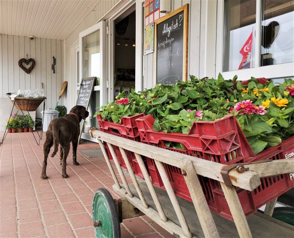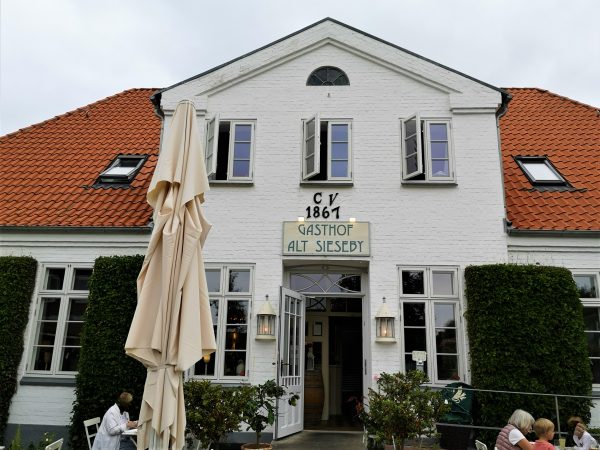 Wir haben den Bummel durch das Dörfchen direkt mit einer kleinen Wanderung am schilfbestandenen Schleiufer verbunden – und mit einem Mittagessen im Gasthof „Alt Sieseby“. Hier wird großartig mit regionalen Zutaten gekocht. Zum Beispiel Braten vom Angler Sattelschwein, eine fast ausgestorbene Rasse, die im nahen Gut Stubbe aufgezogen wird. Unter freiem Himmel. Das Gut betreibt auch einen Hofladen, in dem wir uns eingedeckt haben. Natürlich ist auch was für unseren Amos abgefallen. 😊