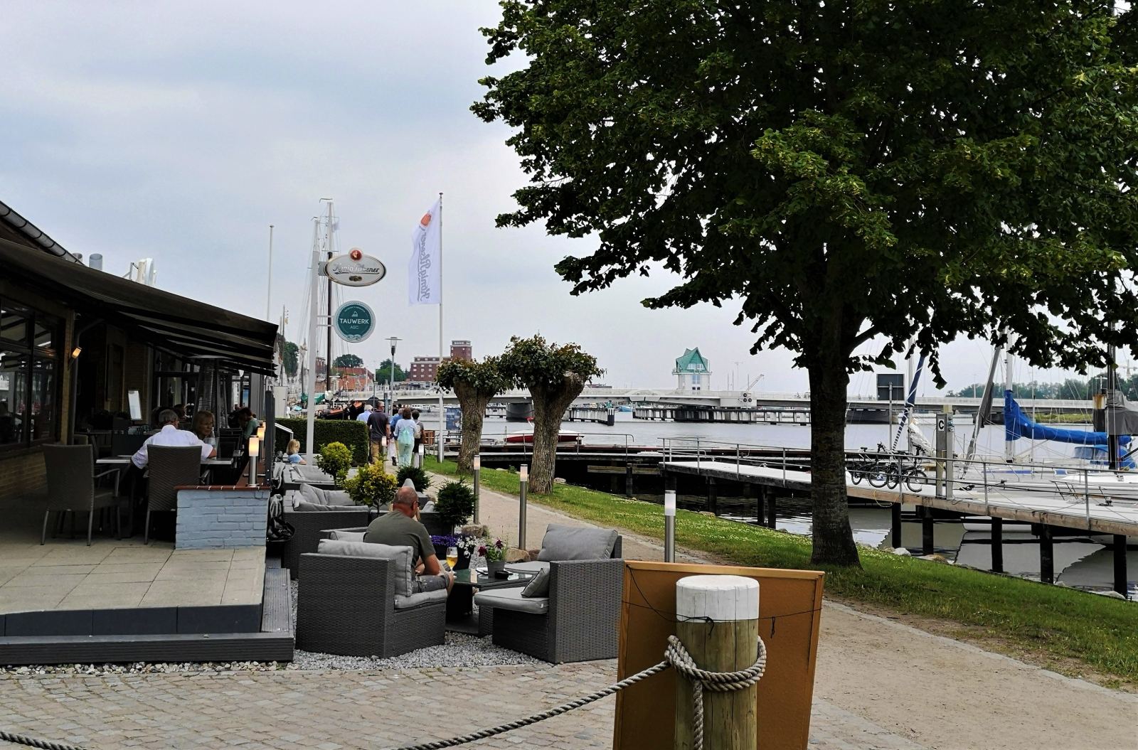 In Kappeln haben wir auch einen sehr schönen, ruhigen Platz gefunden, wo unser Amos, bei unserem Besuch kaum aus dem Welpenalter heraus, einen Mittagsschlaf einlegen konnte: das Restaurant und Café Tauwerk mit großem Biergarten direkt am historischen Hafen. Die Küche ist regional, das Konzept super (Schüler:innen können hier herausfinden, ob ihnen Kochen Spaß macht) und der Blick auf die Klappbrücke, die sich für die Yachten auf der Schlei hebt, wunderbar. Der Kuchen ist’s übrigens auch.